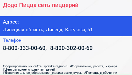 Додо Пицца, сеть пиццерий по адресу Липецкая область, Липецк, Катукова, 51 в дальнейшем Организация, размещена в следующих категориях: