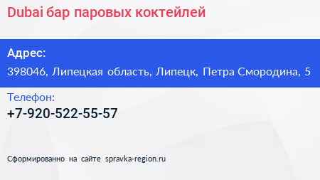 Dubai, бар паровых коктейлей по адресу 398046, Липецкая область, Липецк, Петра Смородина, 5 в дальнейшем Организация, размещена в следующих категориях: