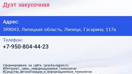 Дуэт, закусочная по адресу 398043, Липецкая область, Липецк, Гагарина, 117а в дальнейшем Организация, размещена в следующих категориях: