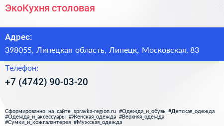 ЭкоКухня, столовая по адресу 398055, Липецкая область, Липецк, Московская, 83 в дальнейшем Организация, размещена в следующих категориях: