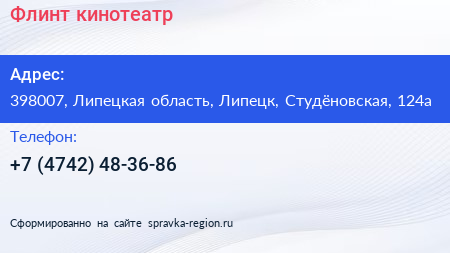 Флинт, кинотеатр по адресу 398007, Липецкая область, Липецк, Студёновская, 124а в дальнейшем Организация, размещена в следующих категориях: