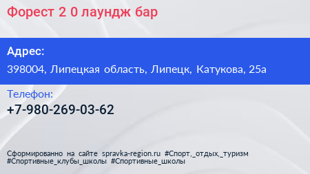 Форест 2.0, лаундж-бар по адресу 398004, Липецкая область, Липецк, Катукова, 25а в дальнейшем Организация, размещена в следующих категориях:
