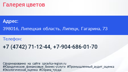 Галерея цветов по адресу 398016, Липецкая область, Липецк, Гагарина, 73 в дальнейшем Организация, размещена в следующих категориях: