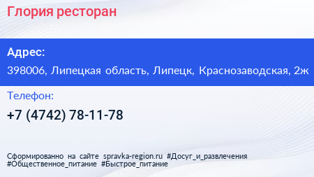 Глория, ресторан по адресу 398006, Липецкая область, Липецк, Краснозаводская, 2ж в дальнейшем Организация, размещена в следующих категориях: