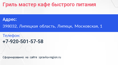 Гриль мастер, кафе быстрого питания по адресу 398032, Липецкая область, Липецк, Московская, 1 в дальнейшем Организация, размещена в следующих категориях: