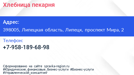 Хлебница, пекарня по адресу 398005, Липецкая область, Липецк, проспект Мира, 2 в дальнейшем Организация, размещена в следующих категориях: