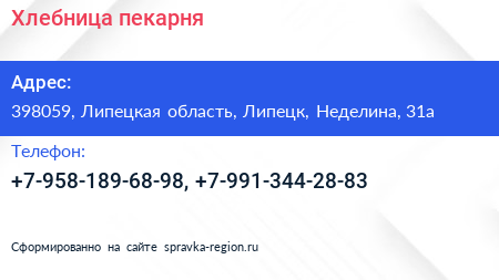 Хлебница, пекарня по адресу 398059, Липецкая область, Липецк, Неделина, 31а в дальнейшем Организация, размещена в следующих категориях: