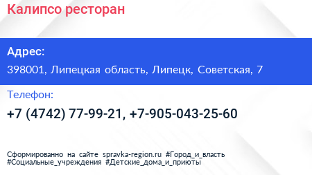 Калипсо, ресторан по адресу 398001, Липецкая область, Липецк, Советская, 7 в дальнейшем Организация, размещена в следующих категориях: