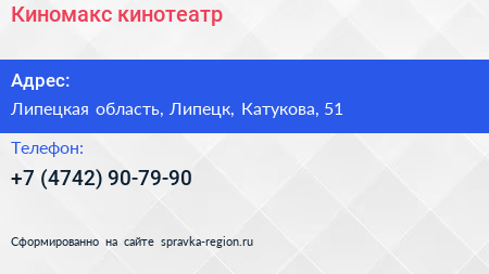 Киномакс, кинотеатр по адресу Липецкая область, Липецк, Катукова, 51 в дальнейшем Организация, размещена в следующих категориях: