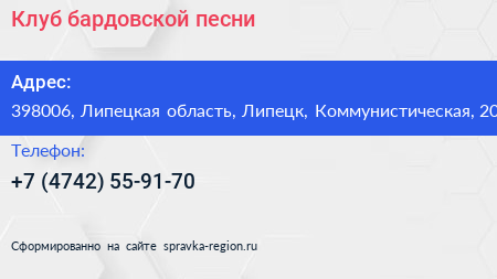 Клуб бардовской песни по адресу 398006, Липецкая область, Липецк, Коммунистическая, 20 в дальнейшем Организация, размещена в следующих категориях: