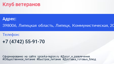 Клуб ветеранов по адресу 398006, Липецкая область, Липецк, Коммунистическая, 20 в дальнейшем Организация, размещена в следующих категориях:
