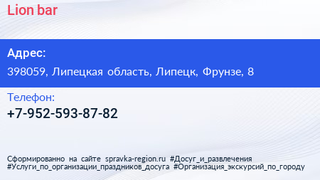 Lion bar по адресу 398059, Липецкая область, Липецк, Фрунзе, 8 в дальнейшем Организация, размещена в следующих категориях:
