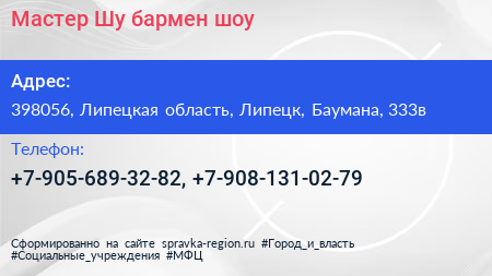 Мастер Шу, бармен-шоу по адресу 398056, Липецкая область, Липецк, Баумана, 333в в дальнейшем Организация, размещена в следующих категориях: