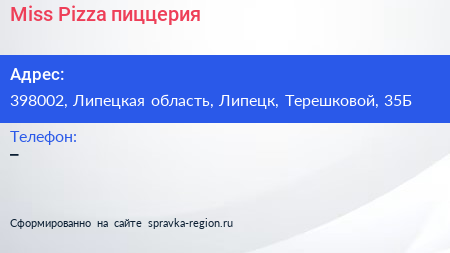 Miss Pizza, пиццерия по адресу 398002, Липецкая область, Липецк, Терешковой, 35Б в дальнейшем Организация, размещена в следующих категориях:
