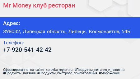 Mr.Money, клуб-ресторан по адресу 398032, Липецкая область, Липецк, Космонавтов, 54Б в дальнейшем Организация, размещена в следующих категориях: