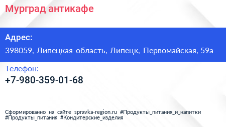 Мурград, антикафе по адресу 398059, Липецкая область, Липецк, Первомайская, 59а в дальнейшем Организация, размещена в следующих категориях: