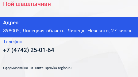 Ной, шашлычная по адресу 398005, Липецкая область, Липецк, Невского, 27 киоск в дальнейшем Организация, размещена в следующих категориях: