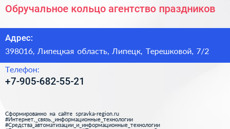 Обручальное кольцо, агентство праздников по адресу 398016, Липецкая область, Липецк, Терешковой, 7/2 в дальнейшем Организация, размещена в следующих категориях: