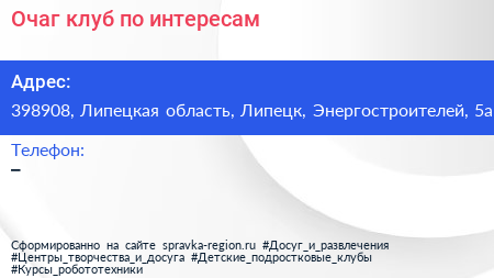 Очаг, клуб по интересам по адресу 398908, Липецкая область, Липецк, Энергостроителей, 5а в дальнейшем Организация, размещена в следующих категориях: