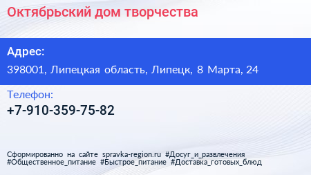 Октябрьский, дом творчества по адресу 398001, Липецкая область, Липецк, 8 Марта, 24 в дальнейшем Организация, размещена в следующих категориях: