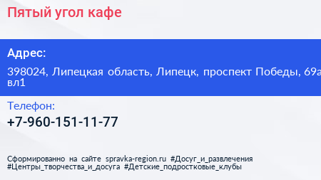 Пятый угол, кафе по адресу 398024, Липецкая область, Липецк, проспект Победы, 69а вл1 в дальнейшем Организация, размещена в следующих категориях: