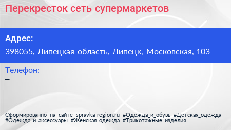 Перекресток, сеть супермаркетов по адресу 398055, Липецкая область, Липецк, Московская, 103 в дальнейшем Организация, размещена в следующих категориях: