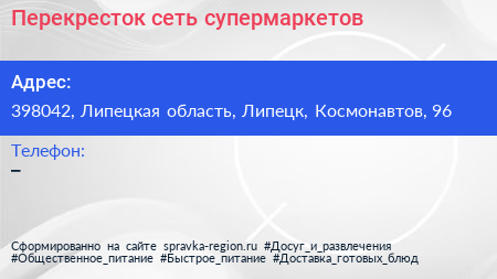 Перекресток, сеть супермаркетов по адресу 398042, Липецкая область, Липецк, Космонавтов, 96 в дальнейшем Организация, размещена в следующих категориях: