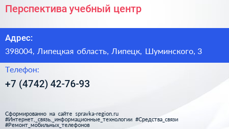 Перспектива, учебный центр по адресу 398004, Липецкая область, Липецк, Шуминского, 3 в дальнейшем Организация, размещена в следующих категориях: