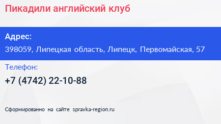 Пикадили, английский клуб по адресу 398059, Липецкая область, Липецк, Первомайская, 57 в дальнейшем Организация, размещена в следующих категориях: