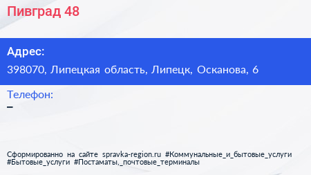 Пивград 48 по адресу 398070, Липецкая область, Липецк, Осканова, 6 в дальнейшем Организация, размещена в следующих категориях: