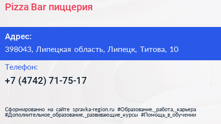 Pizza Bar, пиццерия по адресу 398043, Липецкая область, Липецк, Титова, 10 в дальнейшем Организация, размещена в следующих категориях: