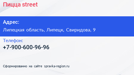 Пицца street по адресу Липецкая область, Липецк, Свиридова, 9 в дальнейшем Организация, размещена в следующих категориях: