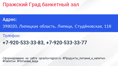Пражский Град, банкетный зал по адресу 398020, Липецкая область, Липецк, Студёновская, 118 в дальнейшем Организация, размещена в следующих категориях: