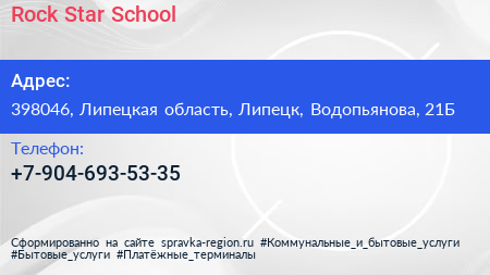 Rock Star School по адресу 398046, Липецкая область, Липецк, Водопьянова, 21Б в дальнейшем Организация, размещена в следующих категориях: