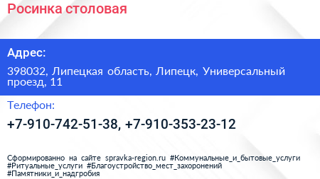Росинка, столовая по адресу 398032, Липецкая область, Липецк, Универсальный проезд, 11 в дальнейшем Организация, размещена в следующих категориях: