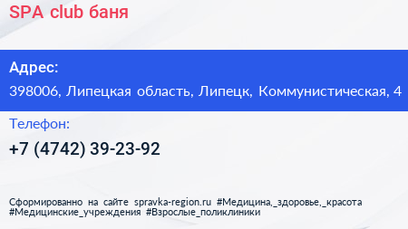 SPA club, баня по адресу 398006, Липецкая область, Липецк, Коммунистическая, 4 в дальнейшем Организация, размещена в следующих категориях:
