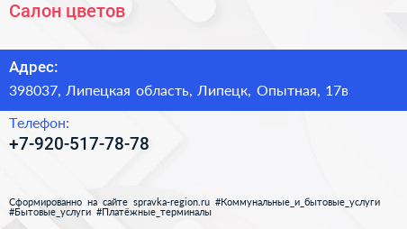 Салон цветов по адресу 398037, Липецкая область, Липецк, Опытная, 17в в дальнейшем Организация, размещена в следующих категориях: