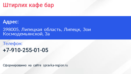 Штирлих, кафе-бар по адресу 398005, Липецкая область, Липецк, Зои Космодемьянской, 3а в дальнейшем Организация, размещена в следующих категориях: