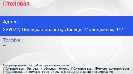 Столовая по адресу 399072, Липецкая область, Липецк, Молодёжная, 4/2 в дальнейшем Организация, размещена в следующих категориях: