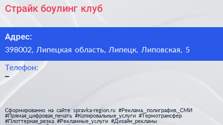 Страйк, боулинг-клуб по адресу 398002, Липецкая область, Липецк, Липовская, 5 в дальнейшем Организация, размещена в следующих категориях:
