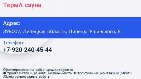 ТермА, сауна по адресу 398007, Липецкая область, Липецк, Ушинского, 8 в дальнейшем Организация, размещена в следующих категориях: