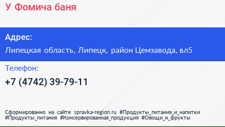 У Фомича, баня по адресу Липецкая область, Липецк, район Цемзавода, вл5 в дальнейшем Организация, размещена в следующих категориях: