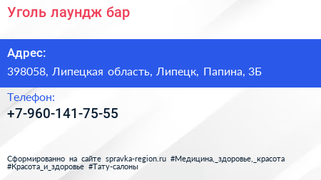 Уголь, лаундж-бар по адресу 398058, Липецкая область, Липецк, Папина, 3Б в дальнейшем Организация, размещена в следующих категориях:
