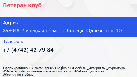 Ветеран, клуб по адресу 398048, Липецкая область, Липецк, Одоевского, 10 в дальнейшем Организация, размещена в следующих категориях: