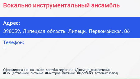 Вокально-инструментальный ансамбль по адресу 398059, Липецкая область, Липецк, Первомайская, 86 в дальнейшем Организация, размещена в следующих категориях: