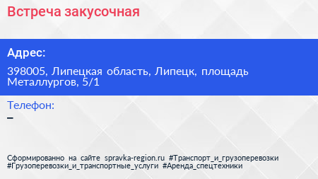 Встреча, закусочная по адресу 398005, Липецкая область, Липецк, площадь Металлургов, 5/1 в дальнейшем Организация, размещена в следующих категориях: