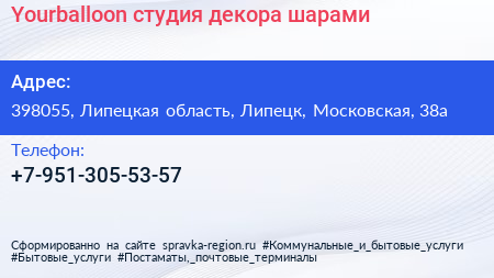 #Yourballoon, студия декора шарами по адресу 398055, Липецкая область, Липецк, Московская, 38а в дальнейшем Организация, размещена в следующих категориях: