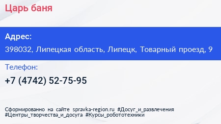 Царь баня по адресу 398032, Липецкая область, Липецк, Товарный проезд, 9 в дальнейшем Организация, размещена в следующих категориях: