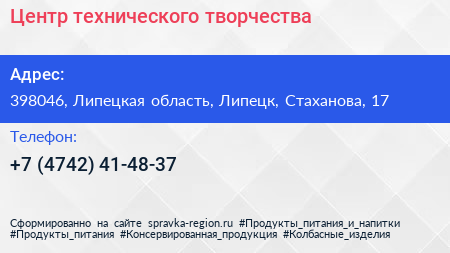 Центр технического творчества по адресу 398046, Липецкая область, Липецк, Стаханова, 17 в дальнейшем Организация, размещена в следующих категориях: