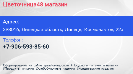 Цветочница48, магазин по адресу 398016, Липецкая область, Липецк, Космонавтов, 22а в дальнейшем Организация, размещена в следующих категориях: